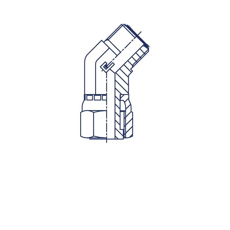 Фитинг угловой 45° ORFS 11/16" D08-10 обжимной. Соединения с торцевым уплотнением (ORFS). Угловой фитинг 45° ORFS с накидной гайкой