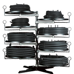 Разматыватель для рукавов высокого давления (РВД) (<вертушка>) предназначен для хранения и использования рукавов высокого давления до и во время опрессовки. Он удобен при частом использовании рукавов разных диаметров и используется в сервисных мастерских, где производится разноплановая продукция. Данный держатель для рукавов позволяет одновременно хранить до 8 бухт рукавов высокого давления, с максимальной нагрузкой на одну полку 240 кг. Рукава могут храниться без картонных или пластиковых катушек. Конструкция удобна в эксплуатации, каждый рукав подается к отрезной машине через специальное кольцо
